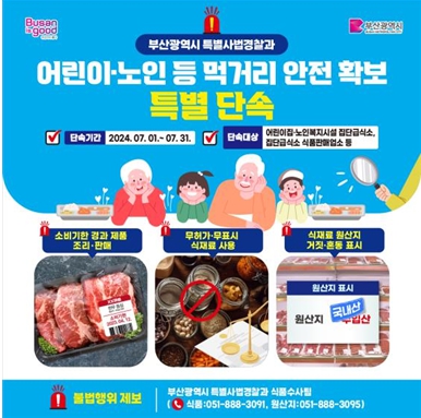 [뉴스서울] 부산시 특별사법경찰과는 오는 7월 한 달간 어린이집·노인복지시설 집단급식소와 집단급식소 식품판매업소를 중심으로 식품 안전 관리 특별단속을 벌인다고 밝혔다.