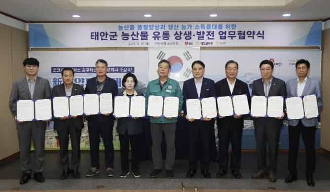 군은 지난 26일 군청 소회의실에서 가세로 군수를 비롯해 전재옥 태안군의회 의장, 윤희철 농협중앙회 태안군지부장, 태안·안면도·근흥·소원·원북·소원 지역농협조합장 등 10여 명이 참석한 가운데 ‘태안군 농협조합공동법인 설립·발전 업무협약식’을 개최했다고 밝혔다.