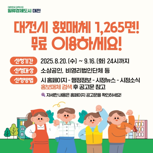 [뉴스서울] 대전시는 관내 소상공인과 비영리단체의 홍보 부담을 덜어주기 위해 시 보유 홍보 매체 1,265면을 무료로 개방한다.
