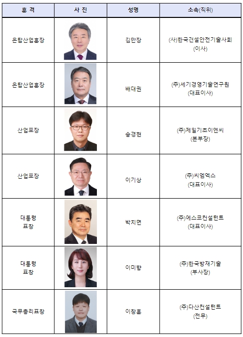 산업포장은 이기상 ㈜씨엠엑스 대표이사와 송경현 ㈜제일기초이엔씨 본부장, 대통령 표창은 박치면 ㈜에스코컨설턴트 대표이사 등 5명에게 수여될 예정이다.
