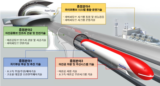 이번 연구개발 내용은 자기부상·추진 기술 개발에 해당하며, 하이퍼튜브 전용 선로, 초전도 전자석 시스템, 주행 제어 기술, 차체 설계·제작 등 4가지 세부 기술 개발을 통해 차량의 부상·추진을 검증할 계획이다.