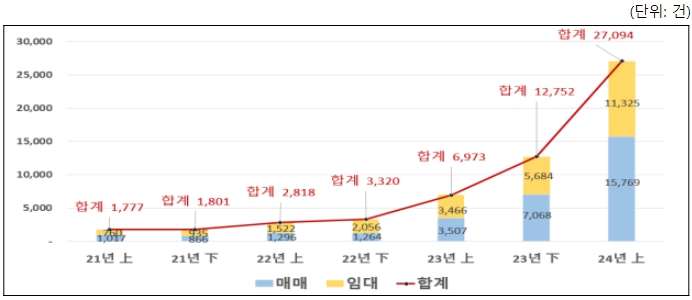 전자계약시스템이 도입된 초기에는 공공기관에서 주로 사용했으나,최근에는 민간의 매매·임대차 계약 등 중개 거래에서도 전자계약 사용이 확산되어, ’24년 상반기 중개거래 전자계약 건수가 전년동기 간 대비 4배 증가하는 등 이용률이 증가하고 있다.