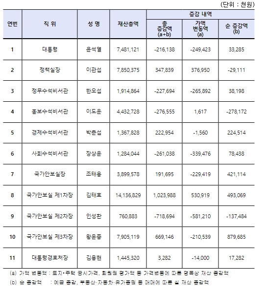 ▲ 주요 직위자 재산증감 현황 - 대통령비서실, 국가안보실, 대통령경호처 |