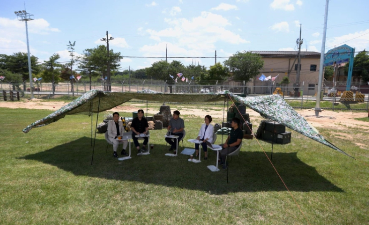 ▲ ‘JSA 경비대대에서 야외 녹화중인 역전다방’ 왼쪽부터 이세환 무기전문기자, 채승병물리학박사, MC허준, 특별게스트 김보영박사,심호섭 육군사관학교 군사사학과 교수 |