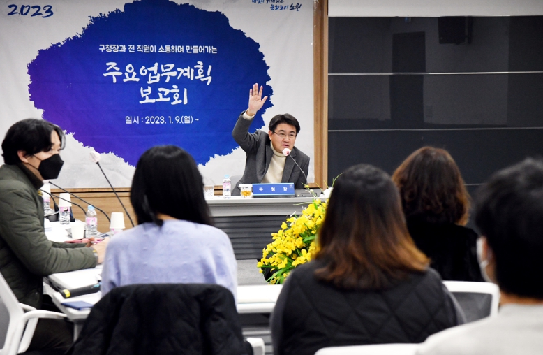 ▲ 오승록 노원구청장이 일선 직원들과 함께하는 업무보고를 통해 소통의 시간을 갖는 모습 |