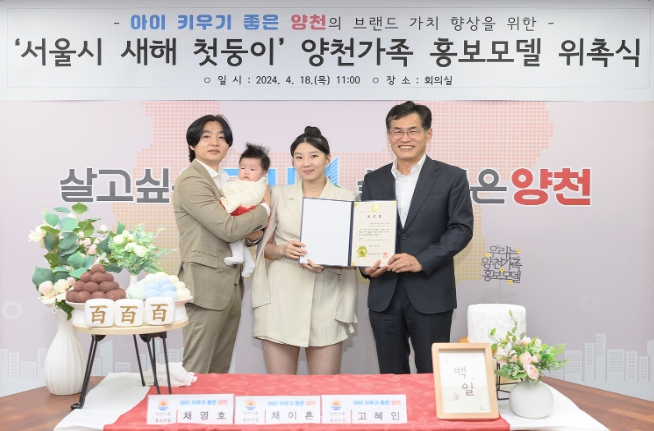18일 오전 구청 회의실에서 열린 위촉식은 최근 백일을 맞은 첫둥이 가족을 축하하기 위한 백일상 콘셉트로 진행됐으며, 이를 위해 관내 신정종합사회복지관의 백일상 무료 대여서비스를 활용했다. 이날 위촉장을 전달한 이기재 양천구청장은 건강한 성장을 기원하는 덕담과 함께 홍보모델로서 양육친화 문화 확산에 중요한 역할을 해줄 것을 당부했다.