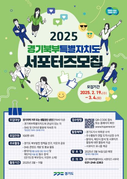 [뉴스서울] 경기도는 경기북부특별자치도 설치에 대한 도민 인식을 높이고 북부발전 홍보를 위한 ‘경기북부특별자치도 서포터즈’ 1기를 2월 19일부터 3월 4일까지 2주간 모집한다.