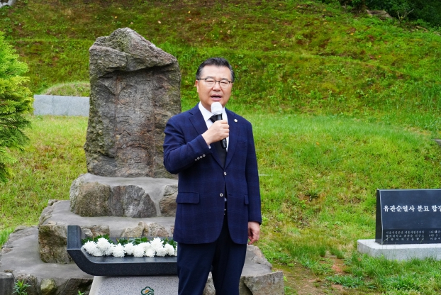▲ 1일 오전 류경기 구청장이 유관순열사 분묘 합장 표지비 앞에서 민선8기 앞으로의 의지를 다지고 있다. |