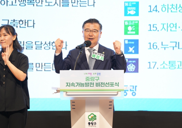 이날 구가 공개한 지속가능발전 비전은 ‘현재와 미래, 사람과 자연이 공존하는 중랑’이다. 구는 선포식에서 비전선언문을 낭독하며 지속 가능한 미래를 위해 주민들과 한마음으로 노력해 나갈 것을 선언했다.