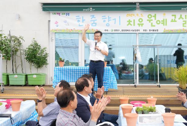 ▲ 치유원예교실 프로그램에 참석한 류경기 중랑구청장의 모습 |