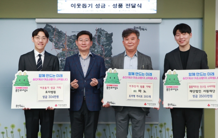 이상일 시장은 “경기가 어려운 상황에서도 어려운 이웃을 생각하는 마음으로 나눔에 동참한 (재)서원재단, ㈜마노, 효자병원 관계자들에게 감사하다”며 “용인특례시도 부족한 부분을 보완해 모든 시민이 행복한 도시를 만들기 위해 노력하겠다”고 말했다.