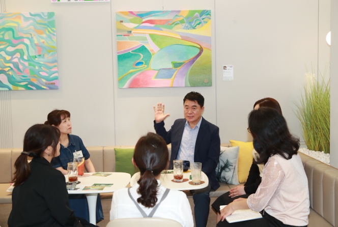 ▲ 스팟 갤러리 1차 전시회에서 참여자들과 함께 스팟갤러리 사업에 대해 의견을 나누고 있는 박준희 관악구청장 |