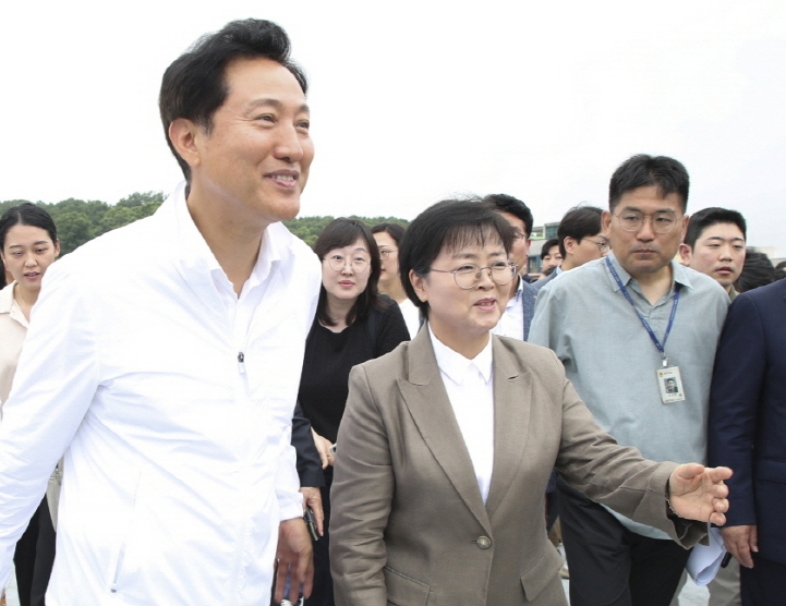▲ 이순희 서울 강북구청장이 2023년 6월 북한산고도지구 현장의 의견을 듣기 위해 덕성여자대학교 차미리사기념관에 방문한 오세훈 시장에게 고도지구 규제 지역 일대에 관해 설명하고 있다. |