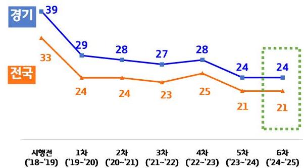 제6차 계절관리제 기간 경기도의 초미세먼지 평균 농도는 24㎍/㎥로, 지난해 제5차와 동일했다. 그러나 ‘좋음’ 일수는 38일에서 47일로 9일 증가해 겨울철 체감 대기질이 개선된 것으로 나타났다.