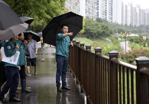▲ 오언석 도봉구청장이 중랑천변을 찾아 안전시설 등을 점검하고 있다 |