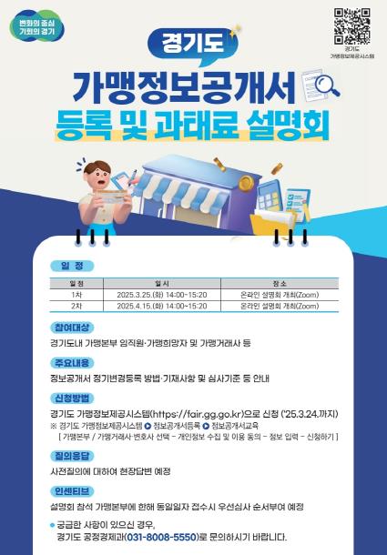 [뉴스서울] 경기도가 가맹본부의 가맹정보공개서 정기변경등록 의무기한인 4월 30일을 앞두고 등록에 어려움을 겪는 가맹본부와 신규 창업 희망자를 위해 3월 25일과 4월 15일 두 번에 걸쳐 정기변경등록 및 과태료 온라인(zoom) 설명회를 연다.