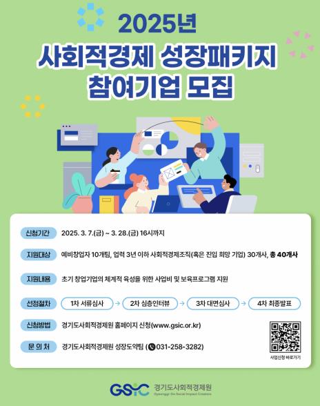 [뉴스서울] 경기도사회적경제원이 ‘2025년 사회적경제 성장패키지’ 사업에 참여할 (예비)창업 기업을 오는 28일까지 모집한다.