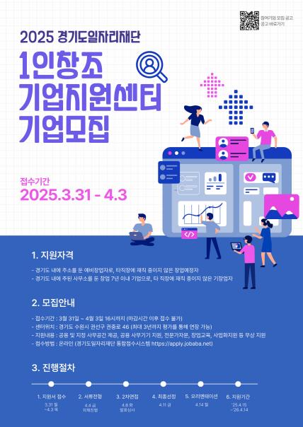 신청 기간은 3월 31일부터 4월 3일 오후 4시까지이며, 공고일(3월 4일) 기준 경기도에 주소를 둔 1인 창조기업 예비 창업자 또는 창업 7년 이내의 경기도 내 주 사무소를 둔 1인 창조기업 창업자라면 신청할 수 있다.
