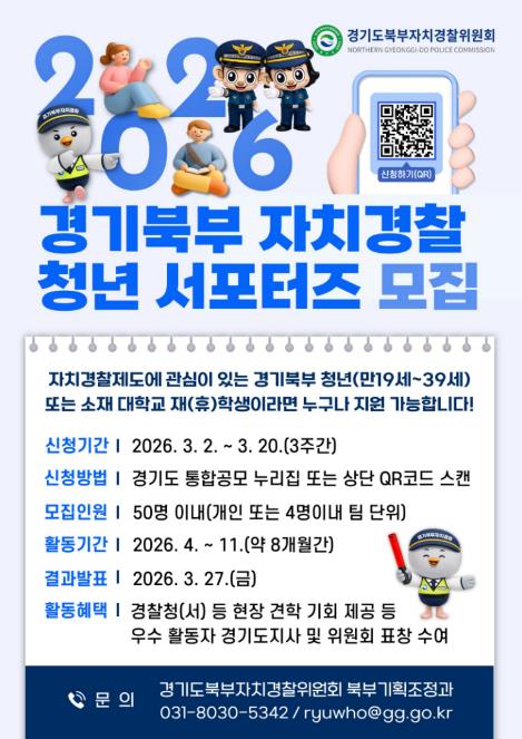 [뉴스서울] 경기도북부자치경찰위원회는 자치경찰제에 대한 청년층의 관심을 높이고 현장 중심 치안 활동을 함께할 ‘2026 경기북부 자치경찰 청년 서포터즈’를 3월 2일부터 20일까지 공개 모집한다.