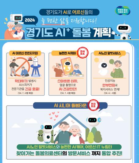 이에 도는 누구나 누리는 주기적 안부확인·건강관리·정서지원서비스를 위해 인공지능(AI)을 도입하기로 했다. 도는 지난 5월 노인돌봄의 정책 방향을 대면 사후관리 중심에서 인공지능을 활용한 비대면 예방 관리체계로 전환하는 내용을 담은 ‘경기노인 AI+돌봄’ 추진계획을 발표하고 ▲늘편한 AI케어 ▲AI 어르신 든든지키미 ▲AI 노인말벗서비스 ▲AI 시니어 돌봄타운 등 4개 정책을 추진한다고 밝혔다.