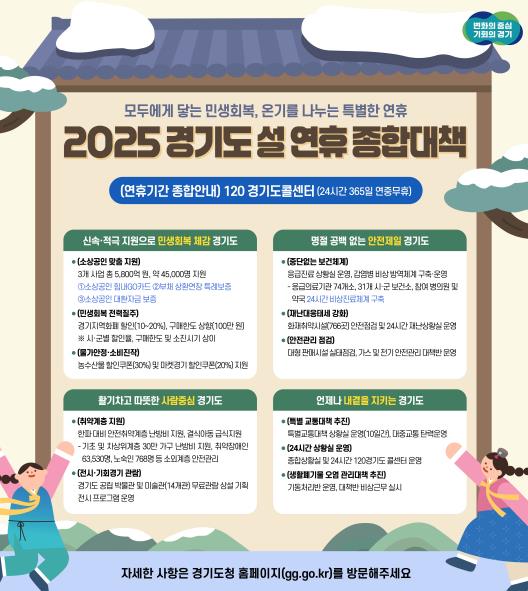 경기도의 2025년 설 연휴 종합대책은 ❶민생회복 ❷안전·보건 ❸복지·문화 ❹교통·편의 등 총 4개 분야로 구성됐다. 주요 내용을 살펴보면 다음과 같다.