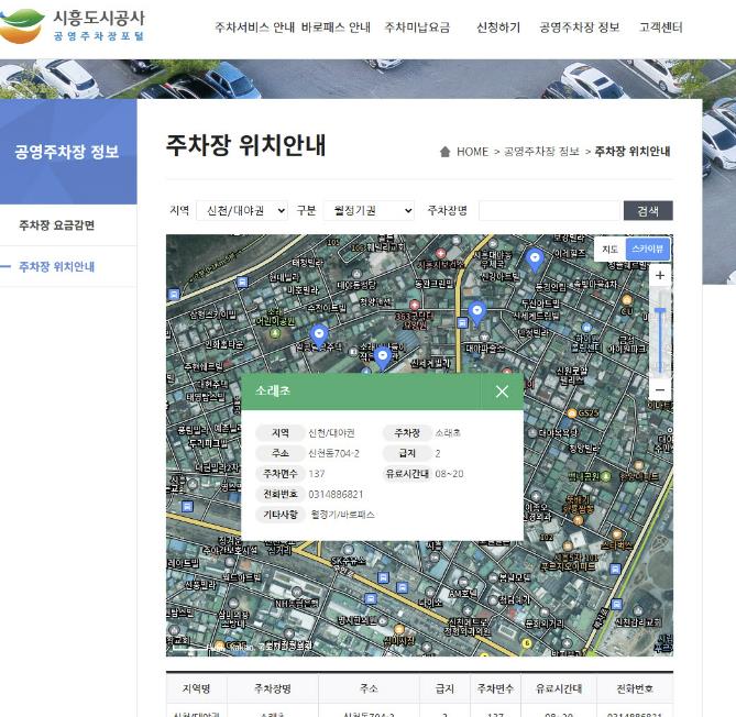 공사는 기존에 시흥시 공영주차포털을 통해 주차장의 목록과 위치, 유료 운영시간을 안내하였다.
