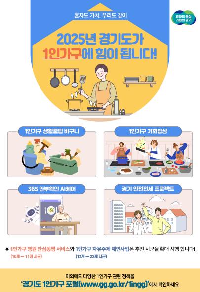 경기도는 도내 171만 1인가구의 삶의 질 향상을 목표로 이같은 내용의 ‘2025년 경기도 1인가구 지원 시행계획’을 마련했다고 6일 밝혔다.