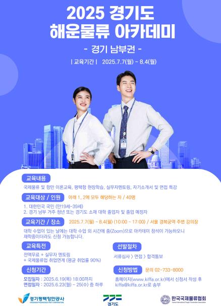[뉴스서울] 경기도와 경기평택항만공사는 해운·항만·물류 전문인력의 양성을 위해 오는 6월 19일까지 ‘해운물류 아카데미’ 교육생 40명을 모집한다.