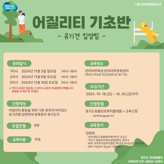 이번 독 스포츠 기초반 운영은 경기도동물보호복지플랫폼 사이트를 통해 10월 25일까지 신청접수 하며 참가 확정자에게는 추후 문자로 안내할 예정이다.