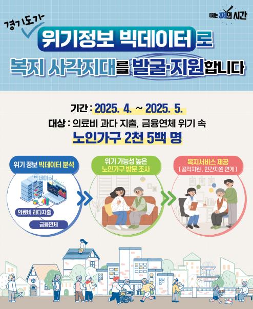 [뉴스서울] 경기도는 5월까지 의료비 과다 지출, 금융연체 위기 등 위기정보 빅데이터를 활용해 발굴된 노인가구 2천500명을 대상으로 복지사각지대를 집중 발굴한다고 26일 밝혔다.