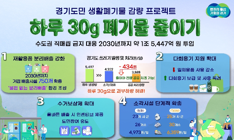 [뉴스서울] 수도권 직매립 금지에 따른 생활쓰레기 감량을 위해 경기도가 2030년까지 5년간 약 1조 5,447억 원을 투입하는 ‘하루 30g, 도민실천형 생활폐기물 감량 프로젝트’를 추진한다.