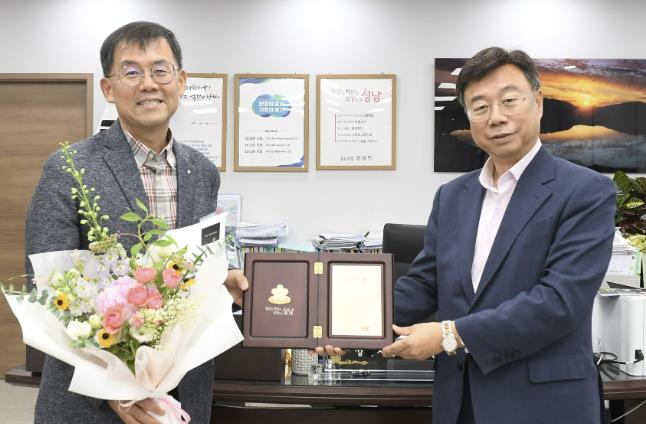 | ▲ 성남시는 최근 분당판교청소년수련관 수영장에서 물에 빠져 의식을 잃은 10대 박모 군을 인공 호흡으로 구조한 김재광 의사(왼쪽)에게 감사패를 전달했다 |