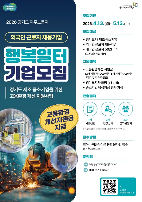 [뉴스서울] 경기도와 경기도일자리재단은 도내 외국인 근로자를 고용한 중소 제조기업을 대상으로 ‘2026년 경기도 이주노동자 행복일터 선정사업’ 참여기업을 모집한다고 20일 밝혔다.