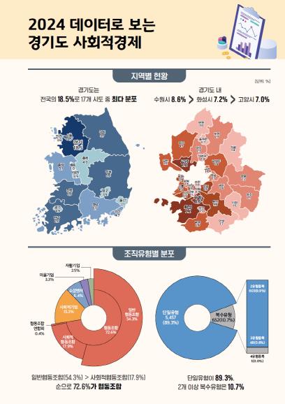 지역별로는 수원시(8.6%), 화성시(7.2%), 고양시(7.0%) 순으로 분포했으며, 조직 유형별로는 협동조합이 전체의 72.6%로 가장 높은 비중을 차지했다. 협동조합은 일반협동조합(54.3%), 사회적협동조합(17.9%), 협동조합연합회(0.4%)로 구성됐다.