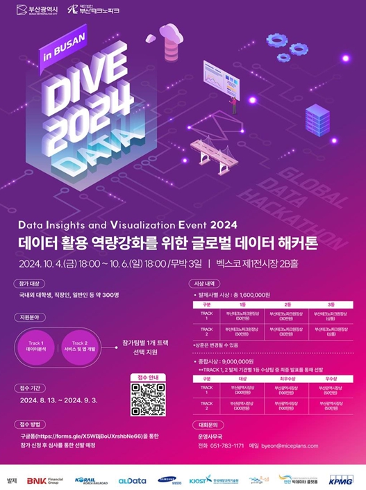 [뉴스서울] 부산시는 올해 처음으로 개최하는 '세계적(글로벌) 데이터 해커톤 대회' '다이브(DIVE) 2024'의 참가자를 오늘(13일)부터 9월 3일까지 모집한다고 밝혔다.