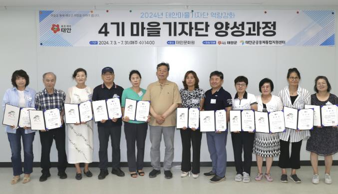 태안군은 지난 7월 31일 태안문화원에서 가세로 군수와 수료생, 주민 등 30여 명이 참석한 가운데 ‘제4기 마을기자단 양성과정 수료식’을 갖고 13명의 수료생을 배출했다고 밝혔다.