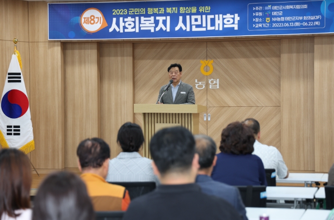 ▲ 지난해 NH농협 태안군지부 회의실에서 진행된 제8기 사회복지 시민대학 모습(2023. 6. 13.). |