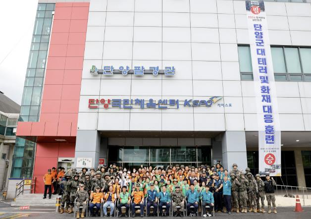 이날 훈련은 대테러·화재 대응훈련으로 제3105부대 1대대와 단양경찰서, 단양소방서, 한국전력단양지사, KT단양지점, 단양의용소방대, 단양자율방재단 등 13개 기관단체가 참여했다.