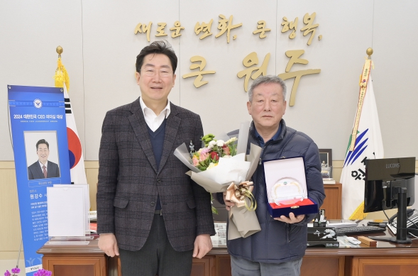 ▲ 원주시, 실종 치매 어르신 찾는 데 결정적 기여한 김인년 씨에게 시민안전 공로 감사패 수여 |