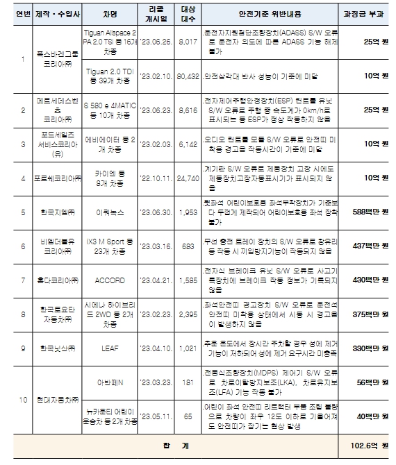 ’23년 1월부터 6월말까지 자동차 안전기준에 부적합하여 시정조치한 10개 제작·수입사에 대해 대상 자동차의 매출액, 시정률, 과징금 상한액 등'자동차관리법'에서 정한 기준에 따라 과징금을 산정했다.