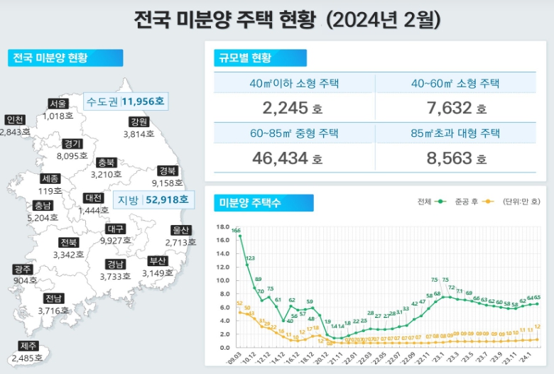 (미분양) 2월말 기준 미분양 주택은 총 64,874호로, 전월(63,755호) 대비 1.8%(1,119호) 증가했다. 준공 후 미분양은 11,867호로 전월(11,363호) 대비 4.4%(504호) 증가했다.