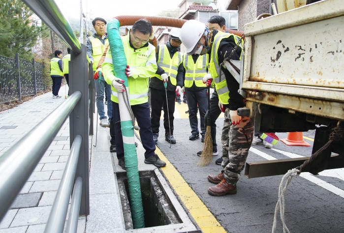 ▲ 류경기 중랑구청장이 27일 구청 직원 · 주민들과 함께 빗물받이 청소기를 이용하여 빗물받이 청소를 하고 있다. |