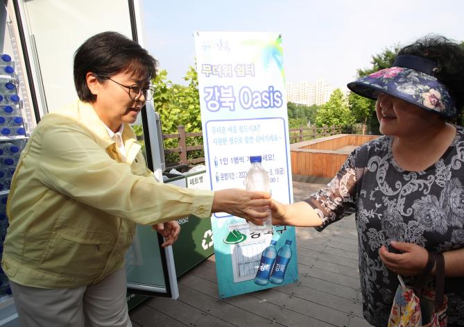 ▲ 이순희 강북구청장이 ‘강북 오아시스 냉장고’ 생수를 무더위로 지친 구민들에게 전달하고 있다. |