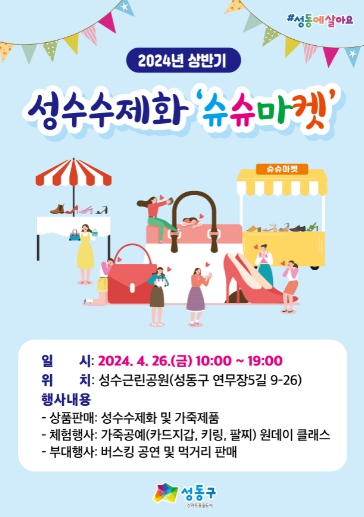 [뉴스서울] 서울 성동구는 오는 26일 성수근린공원(구두테마공원)에서 '2024년 상반기 성수수제화 슈슈마켓 행사'를 개최한다.