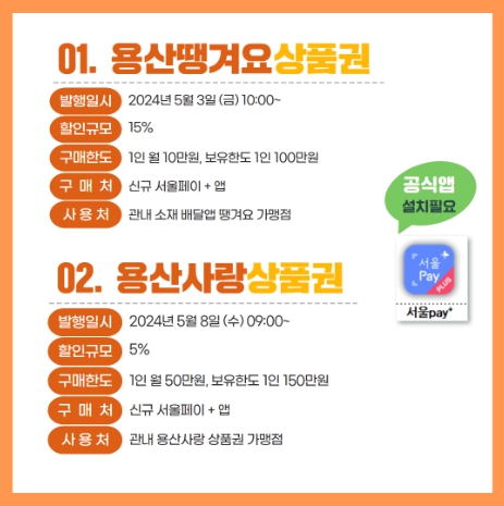 용산땡겨요상품권도 서울페이플러스 앱에서 구매할 수 있으며, 1인당 월 10만원 한도로 100만원까지 보유할 수 있다. 땡겨요 앱에서 용산땡겨요 상품권 구매일로부터 1년 간 현금처럼 사용할 수 있으며, 용산사랑상품권도 사용이 가능하다.