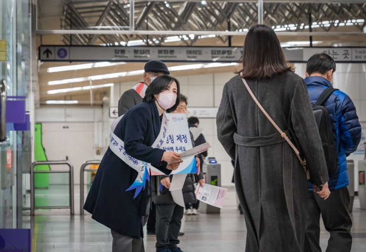 ▲ ‘고덕대교 서명운동’ 캠페인을 펼치고 있는 이수희 강동구청장 |