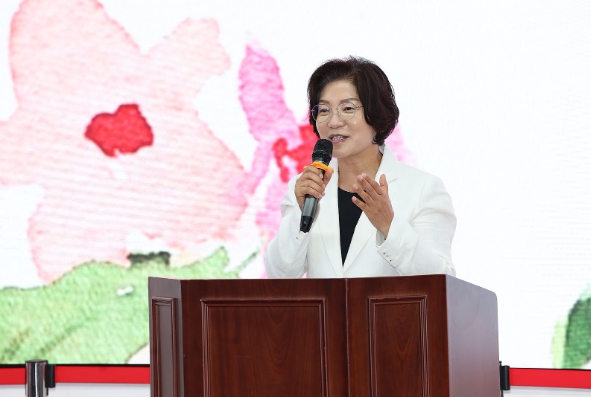 ▲ 지난 14일 열린 2024 은평구 장애인 합동결혼식 인사말 중인 김미경 은평구청장 |