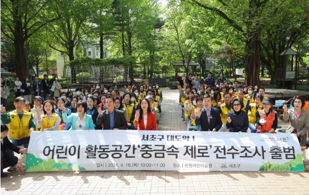 서울 서초구는 18일 반포3동 반원어린이공원에서 “어린이 활동공간 전수조사단” 출범식을 개최했다고 밝혔다. 전수조사단에는 지역주민으로 구성된 어린이 놀이터 환경매니저 51명과 환경유해물질 전문검사기관 5개사가 함께한다.