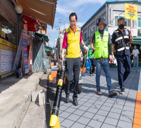 ▲ 지난해 친환경 노면 청소기(글루통)룰 활용하여 거리청소를 하고 있는 최호권 영등포구청장 |