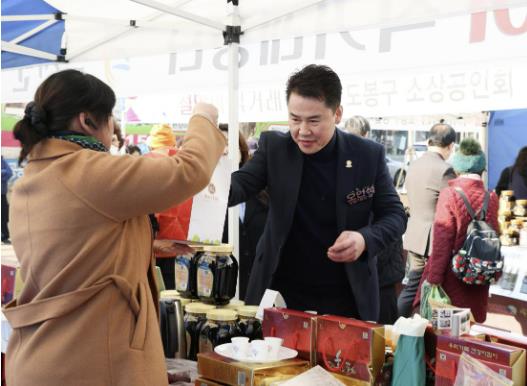 ▲ 오언석 도봉구청장이 2024 도봉구 설맞이 직거래장터에서 지역 특산품을 구입하고 있다. |